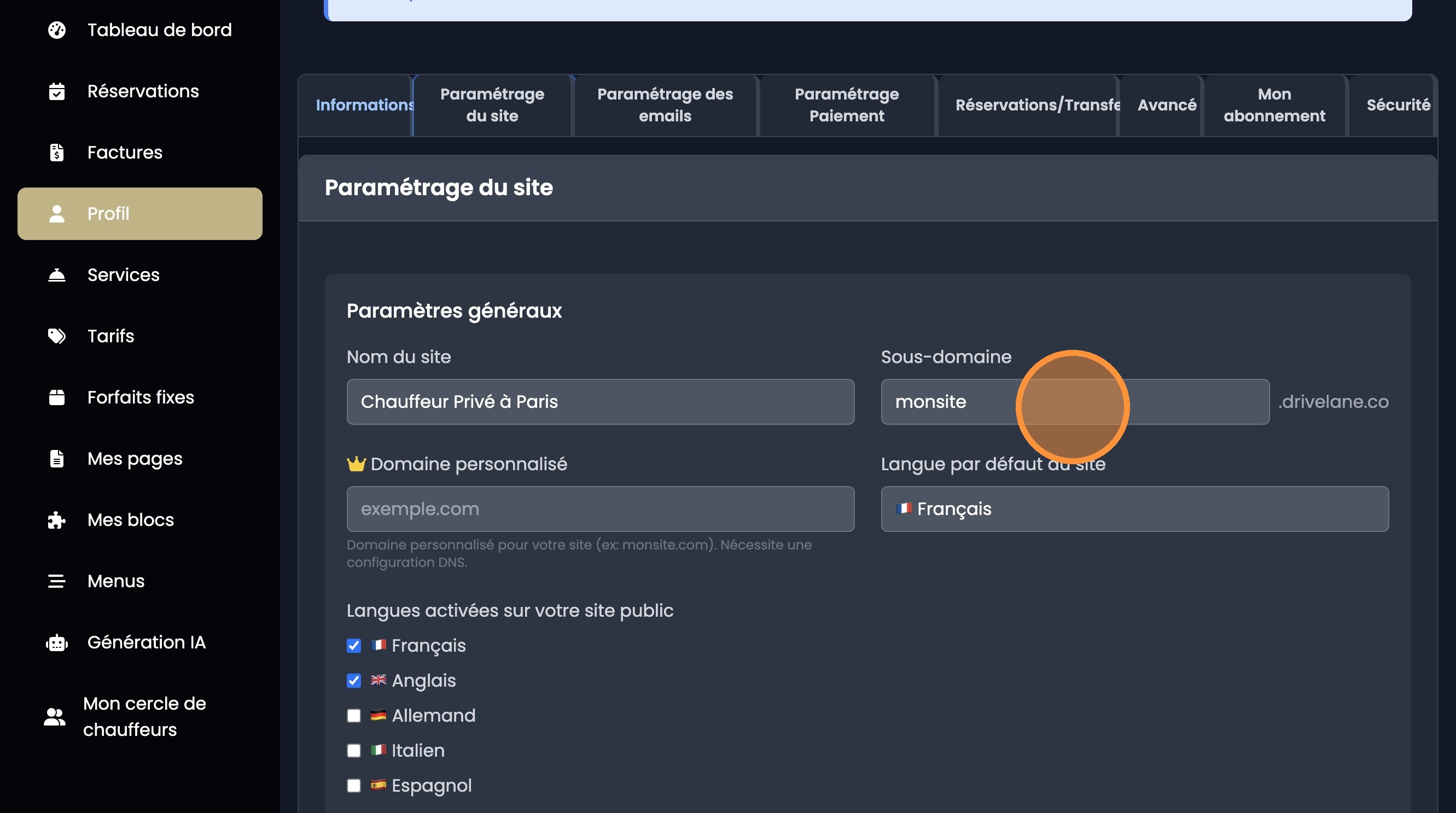 Modifier les paramètres du sous-domaine sur Drivelane Admin
